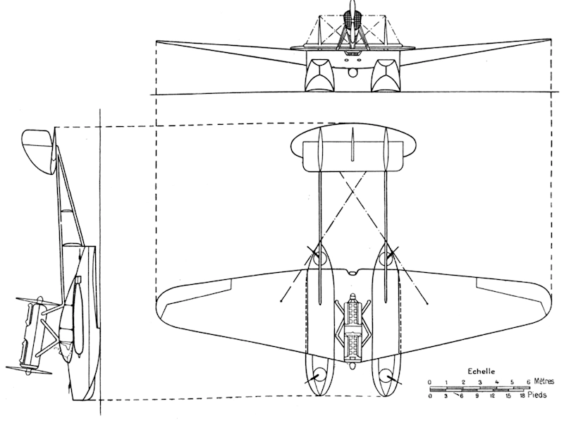 The schematic of the Savoia-Marchetti S.55 seaplane showcases a unique twin-hull, catamaran-style design, complete with two engines arranged in a tandem “pusher-puller” setup, elegantly positioned above a three-section, cantilevered wing. The cockpit of the aircraft is positioned right at the forefront of the wing, while twin booms elegantly link the tailplane to both the wing and the dual hulls.